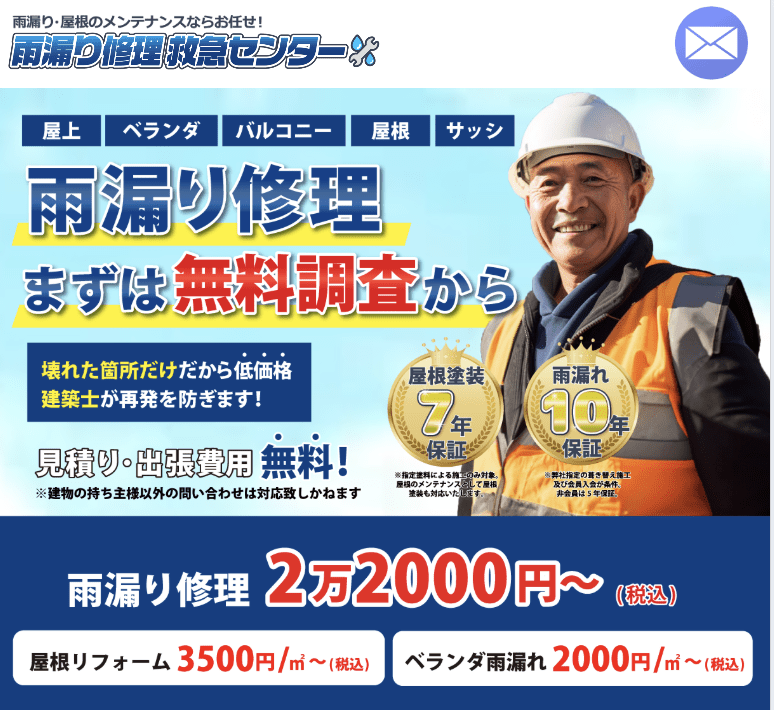 「雨漏り修理救急センター」は、一軒家の雨漏り修理を専門とするサービスです。関東・近畿エリアに対応し、最短即日での現地調査が可能。