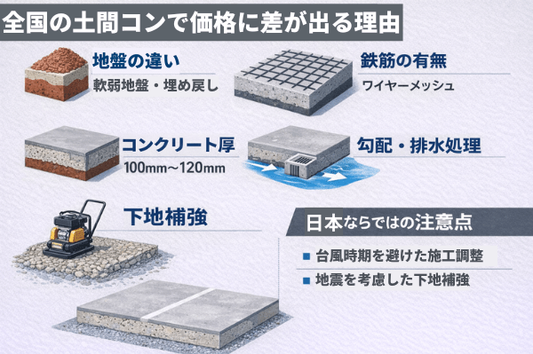 上記のように、面積ごとに価格の幅が大きいのが日本の土間コンクリート工事の特徴です。その理由は主に次の通りです。