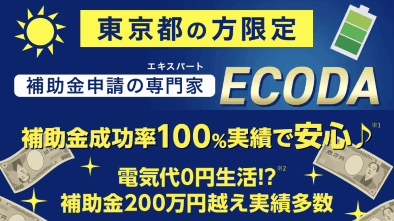株式会社ECODAは、太陽光発電と蓄電池最安値を実現しながら補助金申請成功実績100%を誇る信頼のある企業です。担当者が自宅に訪問し、導入によるメリットが見込める場合のみ蓄電池の提案をしてもらえます。
