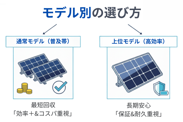 昼間の在宅時間が長い家庭は自家消費型、夜の使用が多い場合は蓄電池の併用がおすすめです。