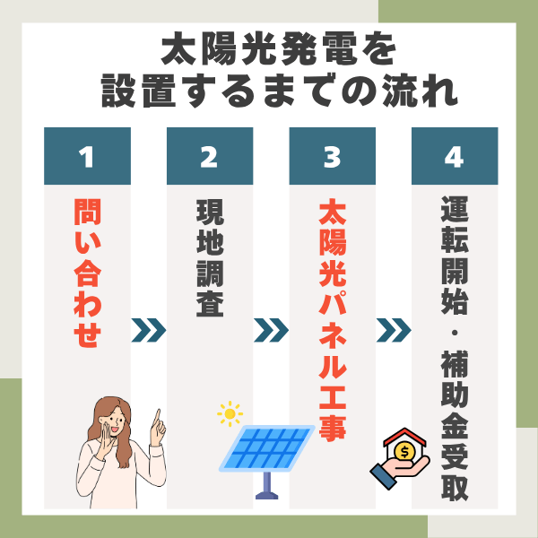 | 設置工事 | 2〜4日 | 足場設置、パネル・配線工事、試運転 |